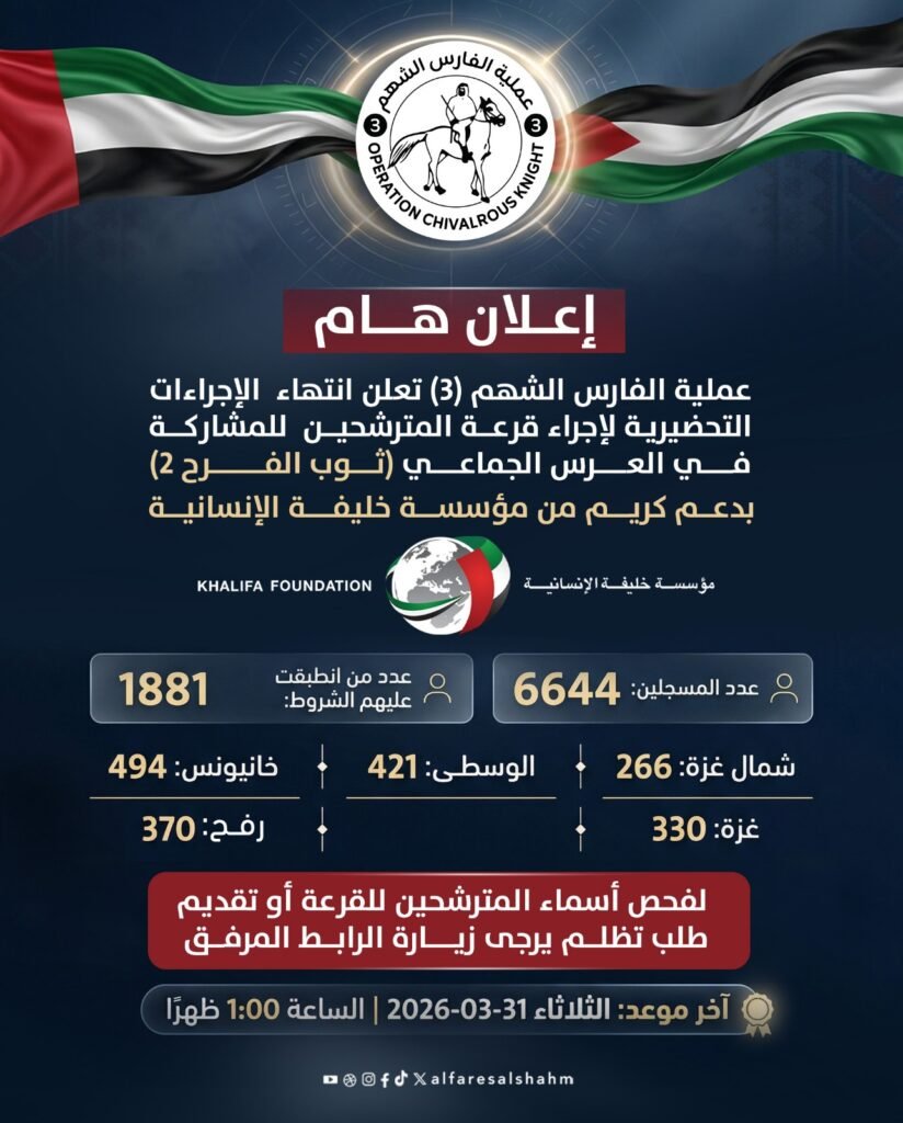 أعلنت عملية الفارس الشهم (3) عن الانتهاء من كافة الإجراءات التحضيرية الخاصة بإجراء قرعة اختيار المشاركين في العرس الجماعي الثاني “ثوب الفرح 2” بدعم كريم من مؤسسة خليفة بن زايد آل نهيان للأعمال الإنسانية، وذلك في إطار جهودها المستمرة لإدخال الفرحة إلى قلوب أبناء قطاع غزة ودعم الشباب المقبلين على الزواج.